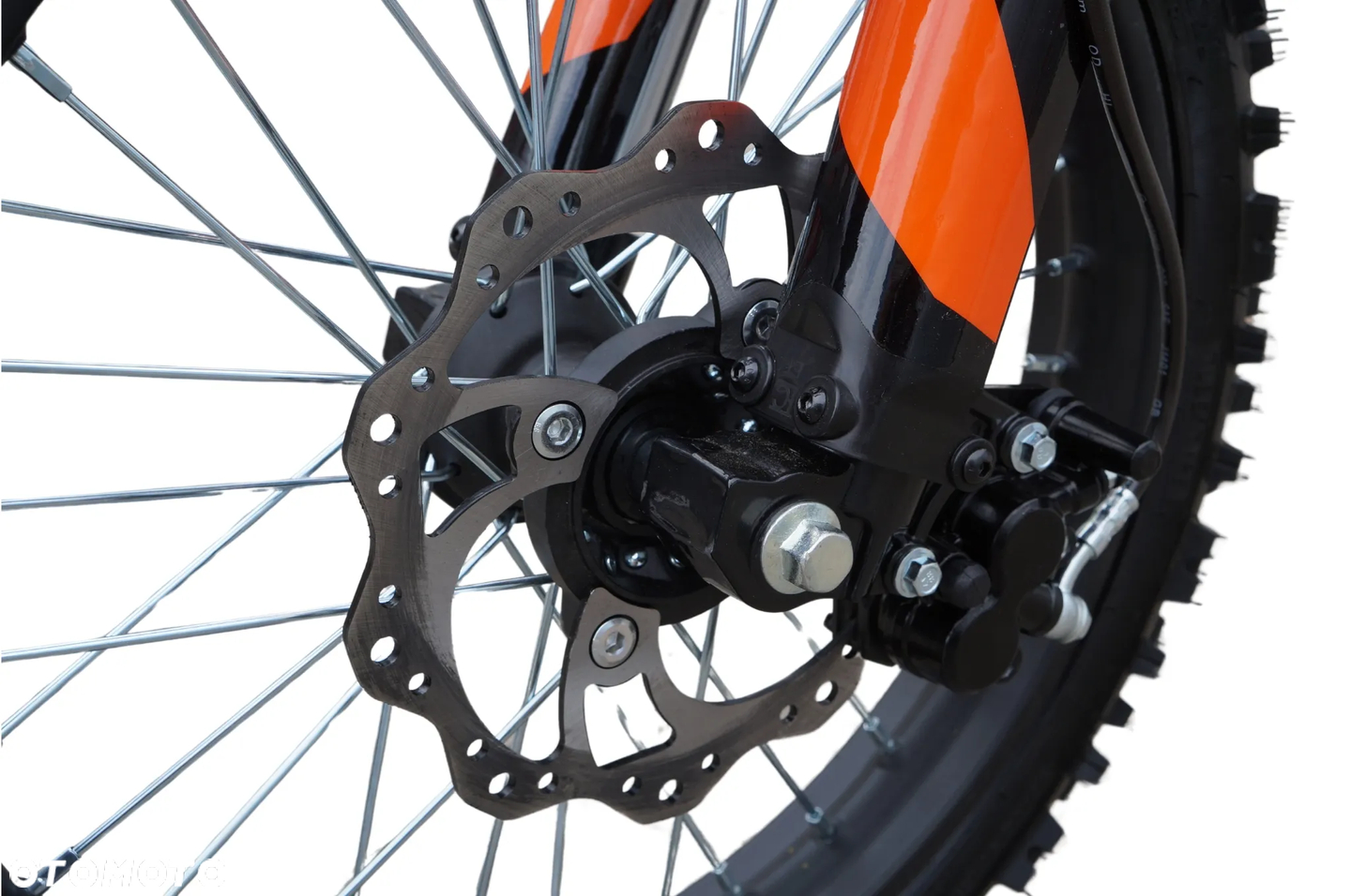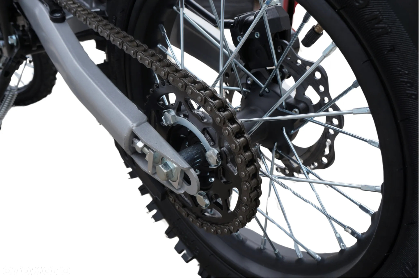 Cross 125 ccm má veľké kolesá 17″/14″ , hydraulické kotúčové brzdy a výkonné tlmenie zabezpečujú komfort a bezpečnosť aj pri jazde v náročnom teréne. Motorka má zosilnený rám, prednú vidlicu a kvalitný nerezový výfuk, čo zvyšuje jej životnosť a výkon.